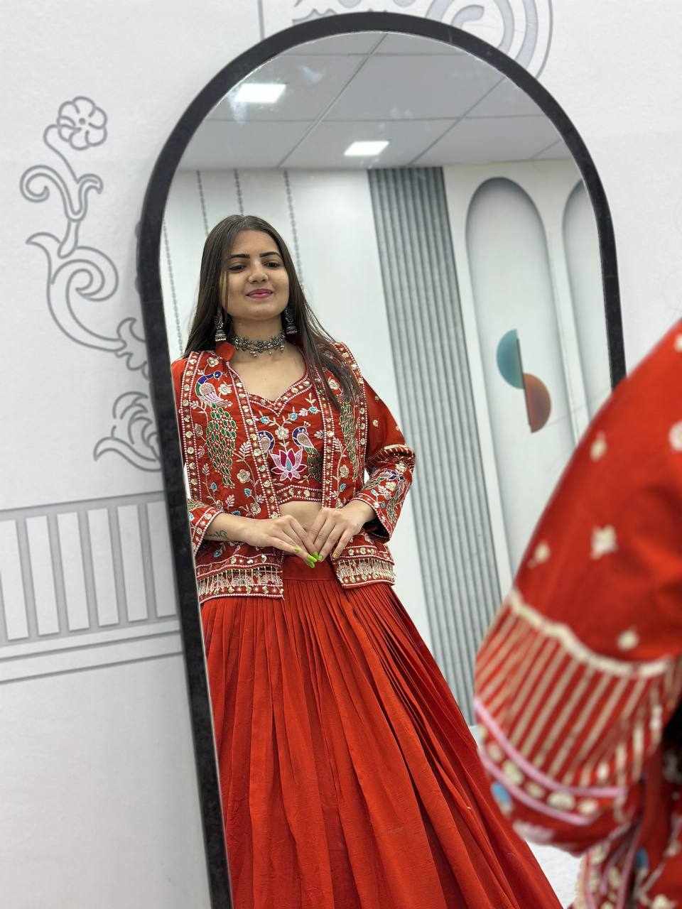 Perfect for Navratri, weddings, festive parties, and special occasions. The grand flair with detailed jacket embroidery creates a stunning statement look.
